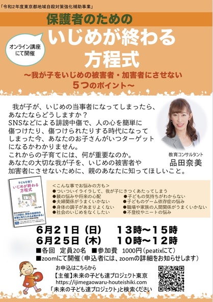 いじめ問題に取り組んでおられる未来の子ども達プロジェクトから講演会のお知らせがありましたので、紹介します。