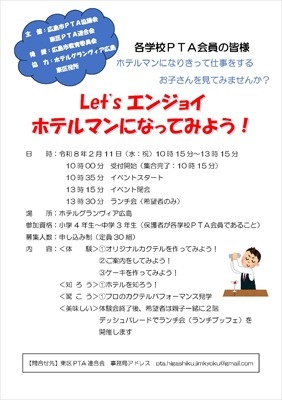 ホテルグランヴィア広島を会場として、親子参加型の「Let'sエンジョイ ホテルマンになってみよう!」を開催します。保護者にはお客様になっていただき、子どもが接客を行います。